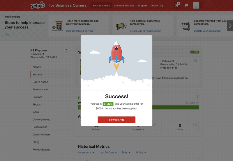 This module (starting at 2/10 complete to give advertisers easy, early wins) is an interactive bar at the top of their account page that gives business owners actionable next steps to increase traffic to their Yelp page. The hypothesis for running this test is that giving business owners clear steps on ways that they can contribute to their success (more control) will reduce churn for Yelp Ads.
